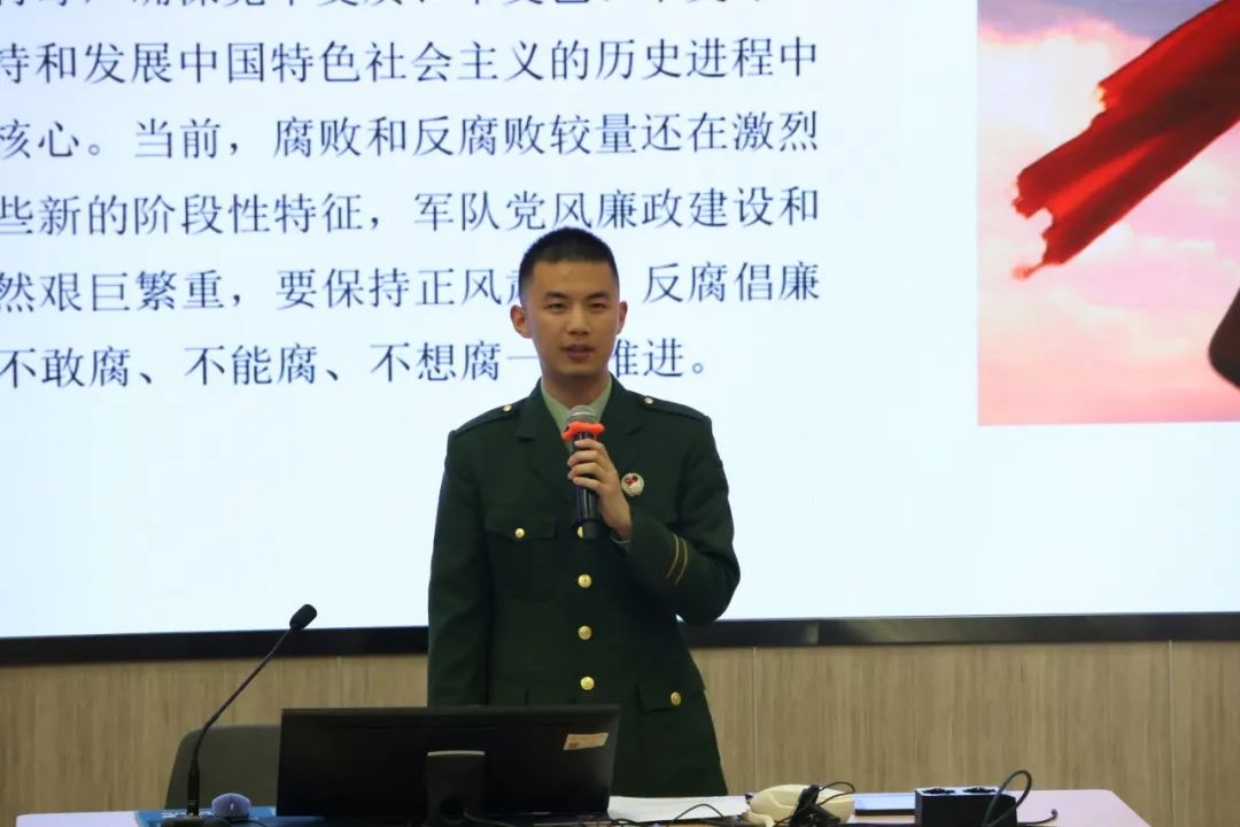 首先,延河先锋国防宣讲团吴铮同志进行了主题为《新时代人民军队的纪律建设与人才建设》的宣讲。宣讲围绕两个内容展开:一是“永葆本色守初心——坚定不移正风肃纪、反腐惩恶”。吴铮同志讲述道,在长期实践中,我军形成了一整套光荣传统和优良作风,作风优良是我军的鲜明特色和政治优势,也是宝贵的精神财富和传家法宝。他进一步结合历史,强调了加强党风廉政建设和反腐败斗争的重要性。二是“强军之道,要在得人——打造高素质、专业化新型军事人才方阵”。吴铮同志还为同志们介绍了全面加强新时代军官队伍建设的主要内容,并特别提到文职人员是现代军队的重要人力资源,鼓励各位同志为2024年秋季征兵报名。