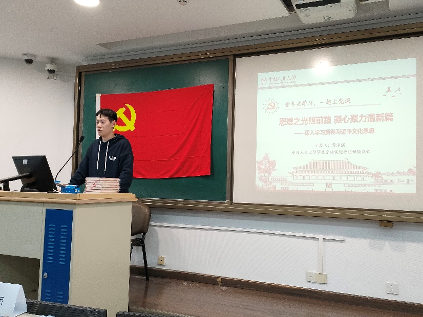 2023年10月28日晚19:00,色情动漫 本科第三党支部与马克思主义色情动漫 2022级硕士生2班党支部于明德法学楼0402教室联合开展“一起上党课”主题党日活动,共同深入学习习近平文化思想。本次活动由校学生党建促进会组织联络部黎泳涵主持,校学生党建促进会研究室张浩泽做主题分享。