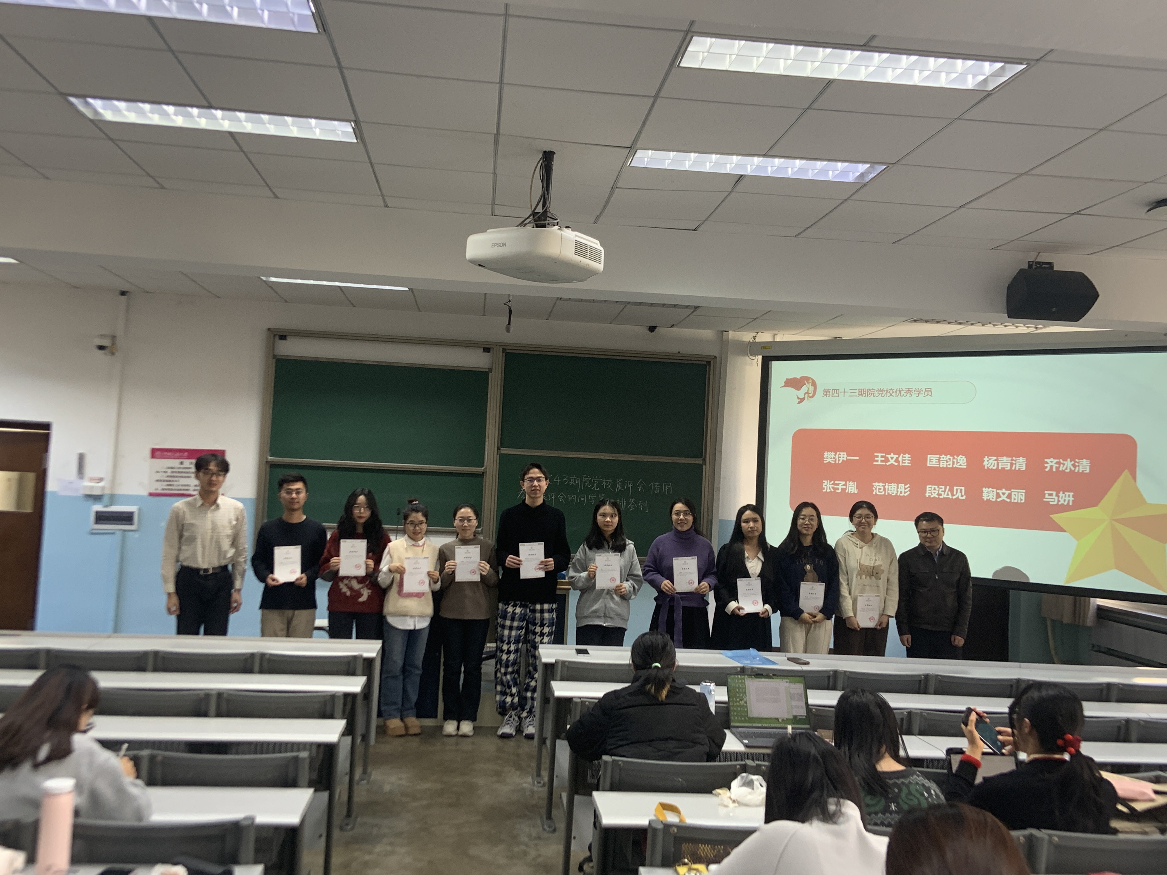 本次院党校选出优秀学员10人:樊伊一、王文佳、匡韵逸、杨青清、齐冰清、张子胤、范博彤、段弘见、鞠文丽、马妍。