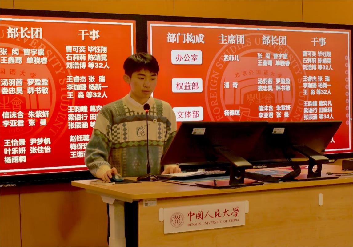 北京外国语大学学生会办公室负责人王鑫骞从部门构成、品牌工作、新学年计划等多个方面对过往的学生工作进行经验总结,她指出要对部门构建进行精简化,提高效率;同时有意识地打造品牌活动,从各个方面丰富便利同学们的生活。王鑫骞强调了学生会在学生权益方面的重大进展,做到广泛收集意见、及时给予反馈,并为每位同学设立专门的窗口,以确保权益工作落实到位。