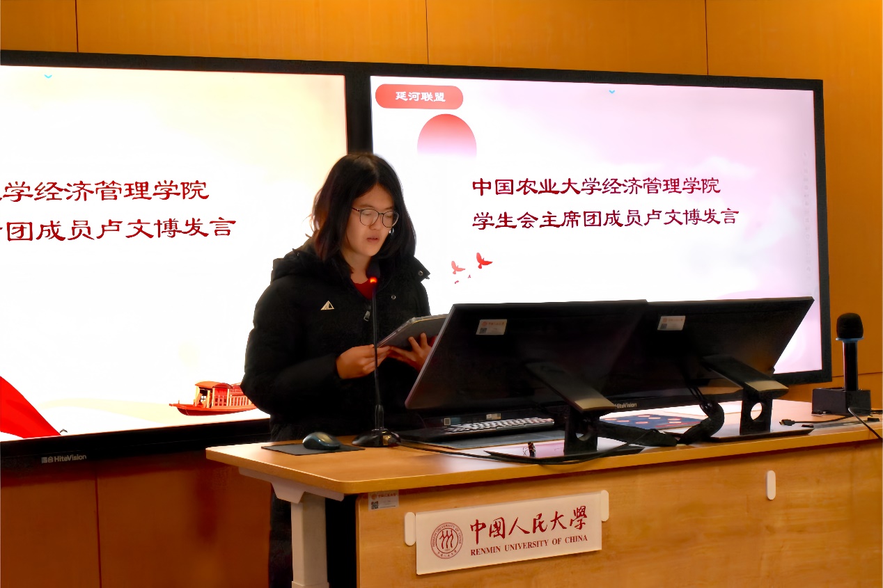 中国农业大学经济管理色情动漫 分团委学生副书记龚伊楠以团学教育和红色建设为核心进行分享,她重点阐释了习近平总书记给中国农业大学科技小院的学生回信精神,以特色团日活动与团学教育为切口,结合学校色情动漫 自身特色,向大家总结了红色教育活动的经验。