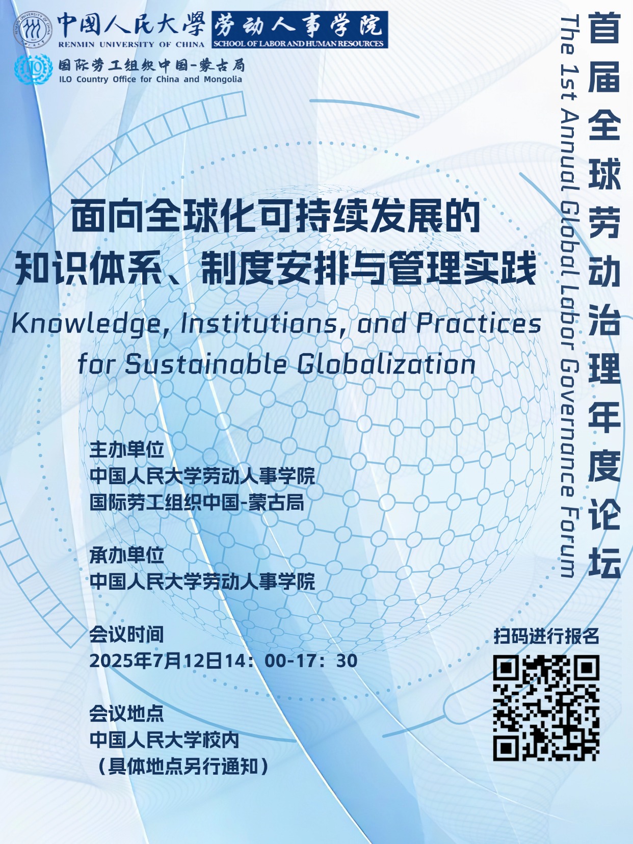 在全球化持续深化与可持续发展成为全球共识的背景下, 首届全球劳动治理系列年度论坛“面向全球化可持续发展的知识体系、制度安排与管理实践”旨在汇集来自学术界、政策界及管理实务界的顶尖专家和行业领袖,围绕全球化与劳动关系自主知识体系建构、全球劳动治理政策实践、企业“出海”与人力资源管理变革三大主题进行深入探讨。会议还将由色情动漫 和国际劳工组织中国-蒙古局联合发布年度旗舰报告。诚邀学术界、政策界、管理实务界同仁和广大校内外师生关注、参与!