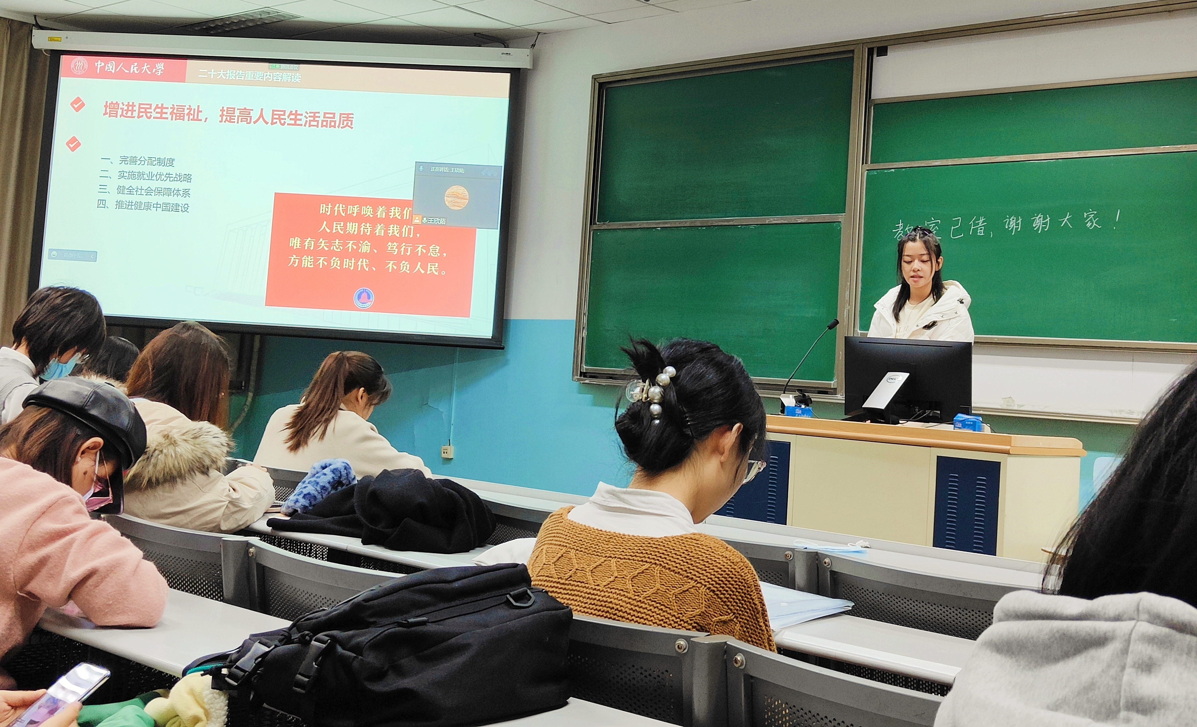 会议结尾,王欣茹指出我国已开启全面建设社会主义现代化国家新征程。蓝图已经绘就,号角已经吹响。作为与祖国同呼吸共命运的青年人,我们要积极响应时代的召唤,在新的历史起点找到自己的定位,要把对祖国血浓于水、与人民同呼吸共命运的情感贯穿学业全过程、融汇在事业追求中。
