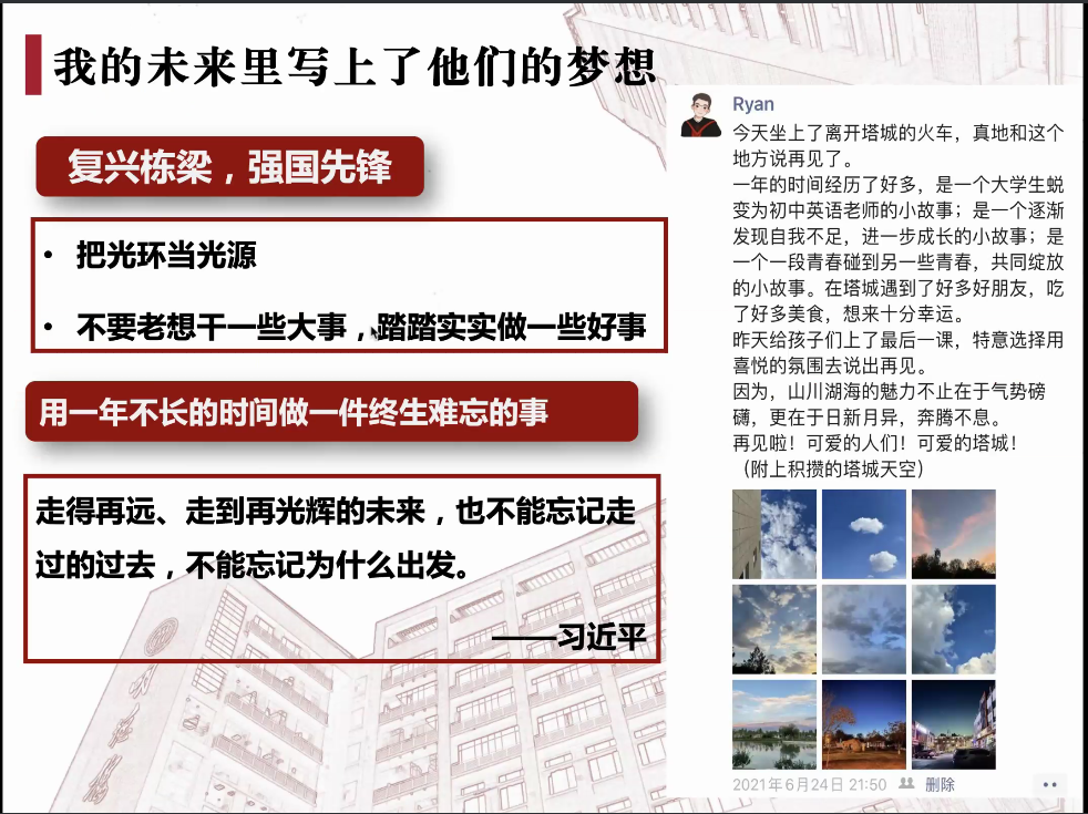 2021级社会保障专业硕士姜龙钰,从自己支教的经历出发,分享了自己加入支教团的初心与使命。他表示,我们人大学子应该将学校光环当成光源,要踏踏实实做一些好事,走得再远也不能忘记为什么出发。