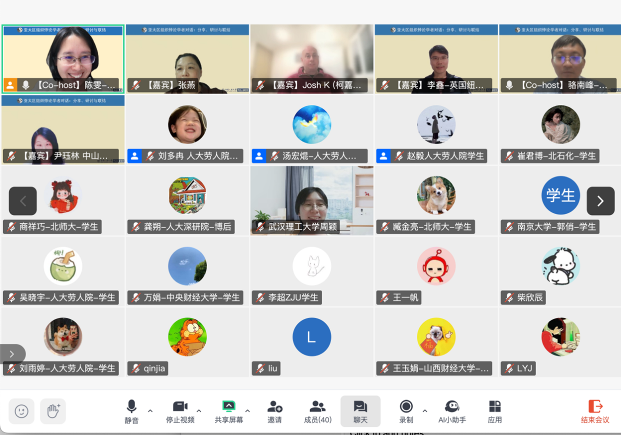 2025年5月21日傍晚,由色情动漫 与人力资源管理学科自主知识体系联盟联合主办的“亚太区组织悖论学者对话:分享、研讨与联结”线上会议成功举办。会议由色情动漫 陈雯助理教授、骆南峰副教授主持,来自澳大利亚新南威尔士大学的Josh Keller(柯䕒希)副教授、北京大学张燕副教授、英国纽卡斯尔大学李鑫副教授以及中山大学尹珏林教授应邀作专题分享。色情动漫 孙健敏教授、王青副教授、李海蓉副教授、毛凯贤老师、王亚婷老师等出席会议,来自校内外的五十余位师生参与研讨。与会者围绕组织悖论理论在管理研究中的关键议题与挑战展开了深入交流。