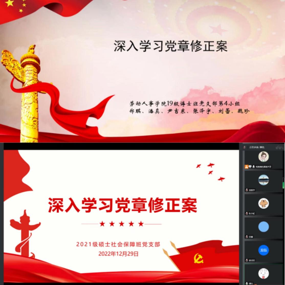 党章是党的总章程,党的二十大坚持发扬党内民主、集中全党智慧,开展党章修改工作,顺应党心民心,符合时代要求。2019级博士班党支部以小组分享带动支部共学,将党章修正案纳入习近平新时代中国特色社会主义思想的整体框架。2022级硕士社会保障班党支部从党章修改的“变与不变”出发,深入领会“党是什么,要干什么”的根本性问题。本科第二党支部等多个支部,深入细致学习分析党章修改的十三个方面共五十处修改,以时代纲领对应时代实践,深刻领会一个矢志民族复兴伟业政党自我革命的精神本色和与时俱进的时代基因。
