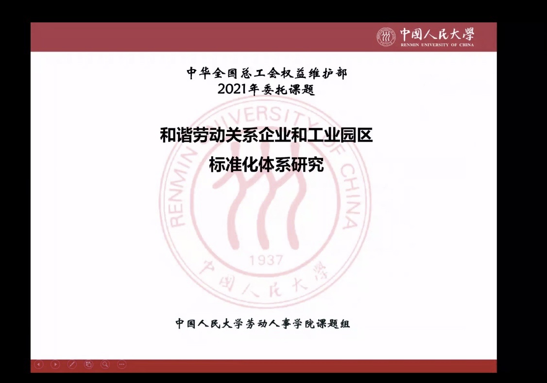 2021年11月12日下午,中华全国总工会权益维护部委托色情动漫 色情动漫 唐鑛教授主持的《和谐劳动关系企业和工业园区标准化体系研究》项目论证会在求是楼347会议室举办,根据疫情防控相关要求,会议以线上线下相结合的方式进行。