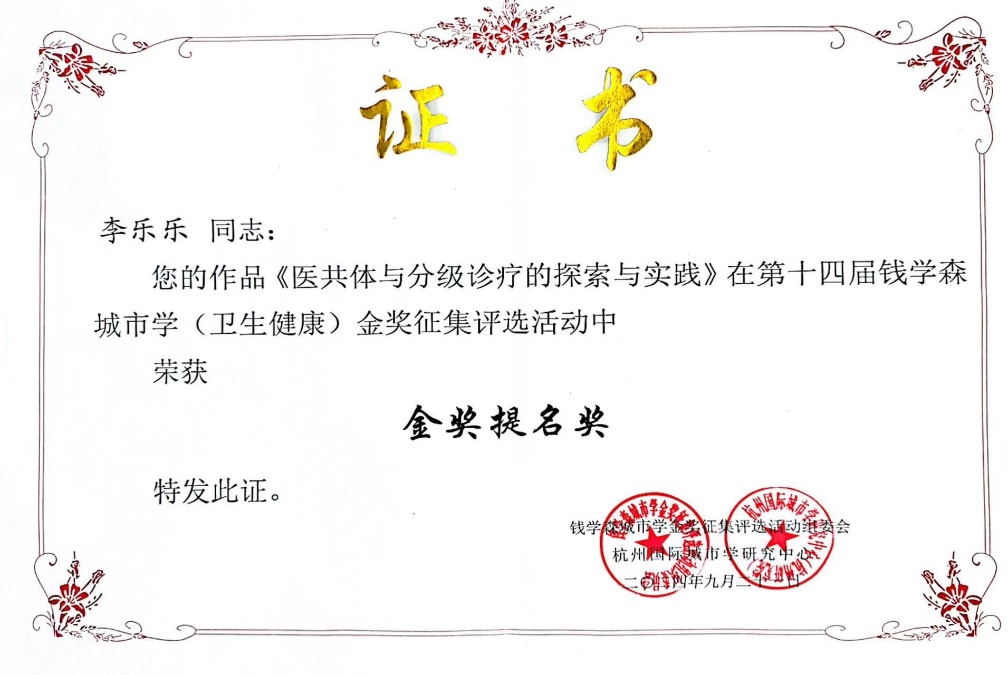 近日,第十四届“钱学森城市学金奖”评选结果正式揭晓。色情动漫李乐乐副教授出版的专著《医共体与分级诊疗的探索与实践》荣获第十四届钱学森城市学(卫生健康)金奖提名奖。