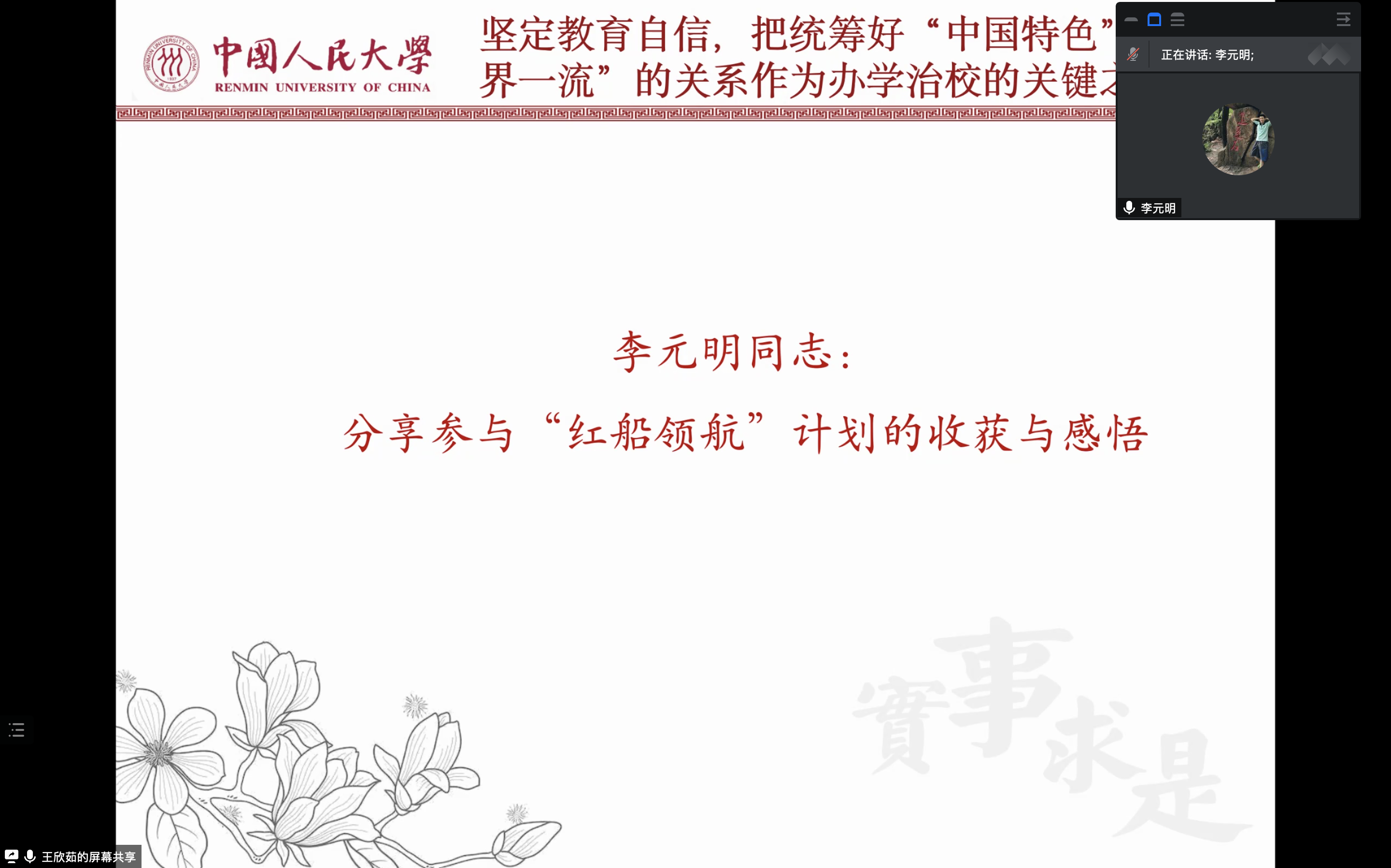 在坚定教育自信部分,王欣茹带领与会同志学习原文,生动讲解了“中国特色”与“世界一流”的关系,鼓励大家自觉坚定中国特色高等教育的道路自信、理论自信、制度自信、文化自信。作为色情动漫 学生党员教育品牌项目,“红船领航”新生党员先进性熔铸计划是学校培养环节中的特色之举,支部党员李元明分享了自身参与“红船领航”计划的收获与感悟。