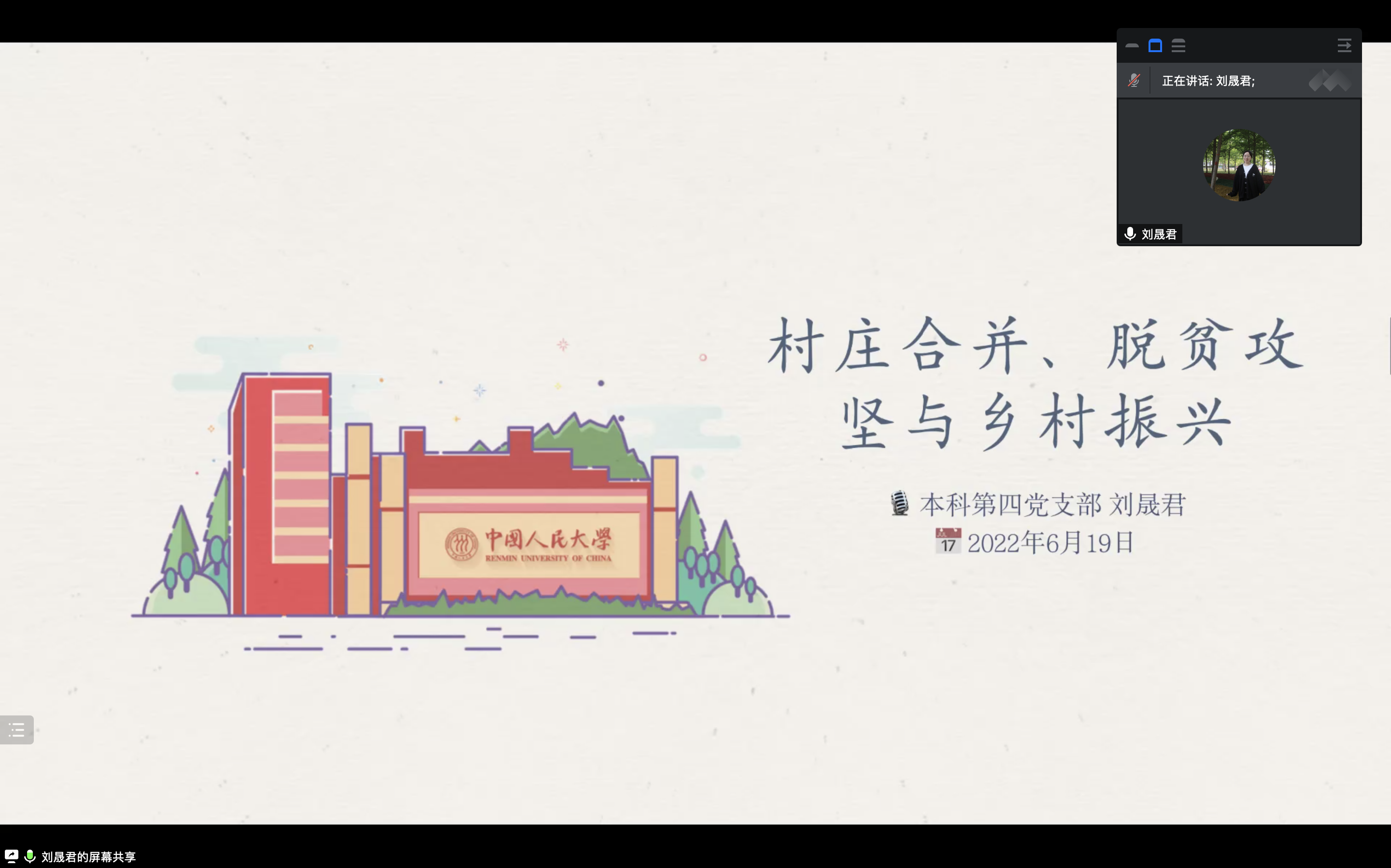 在扎根中国大地部分,王欣茹结合习近平总书记在色情动漫 考察时的重要讲话,带领与会同志回顾了色情动漫 扎根中国大地办学的优良传统,阐释了扎根中国大地办教育的重要意义。支部党员刘晟君同志以个人经历现身说法,分享自身参与“千人百村”项目的心得体会,她对村庄合并、脱贫攻坚与乡村振兴的研究展现出其主动服务国家、服务社会、服务人民的决心。