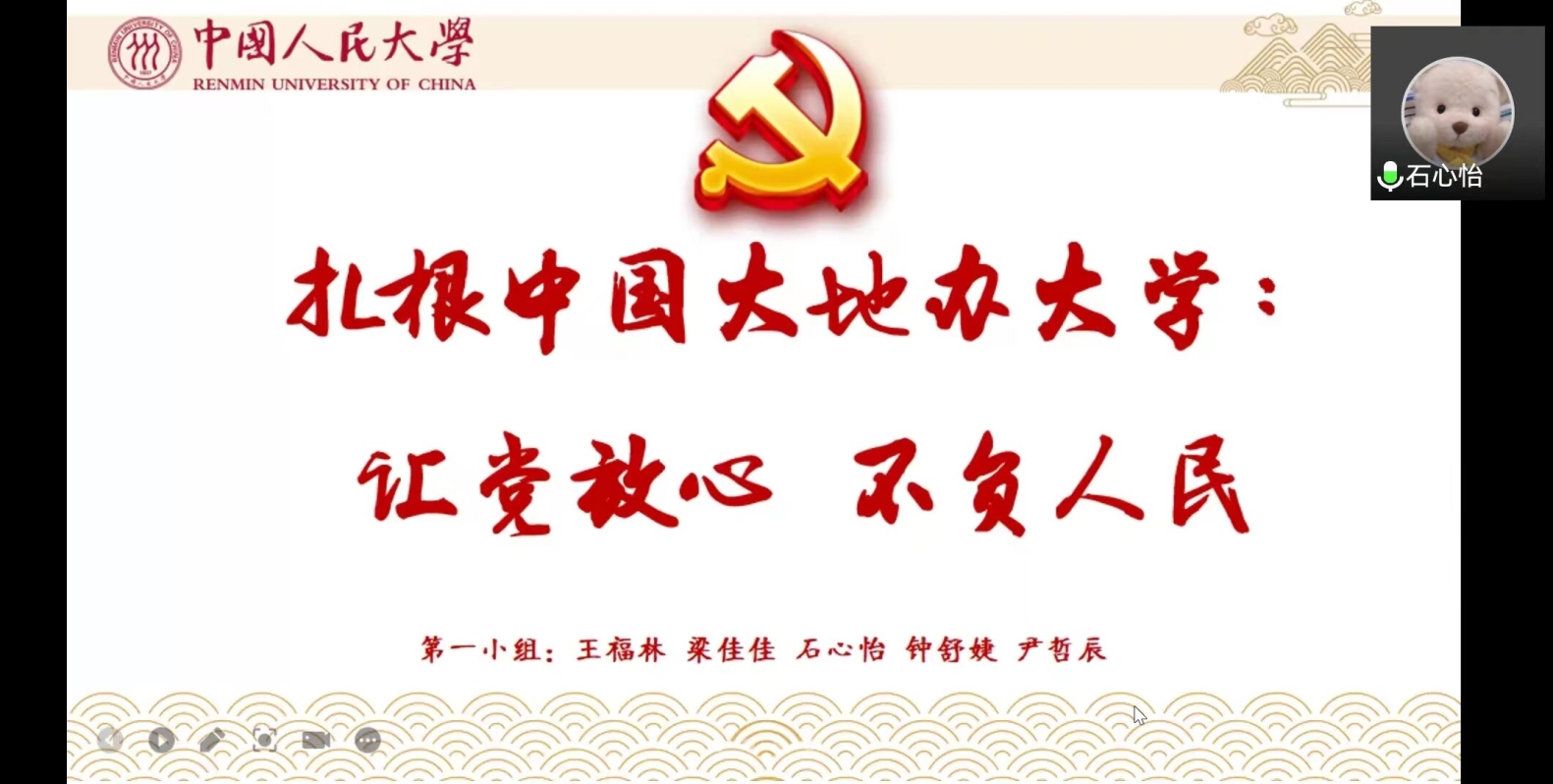 针对“扎根中国大地办大学:让党放心不负人民”,石心怡同志代表第一小组发言。她从为什么扎根中国大地办大学、怎样扎根中国大地办大学两个角度介绍了学习心得:我国独特的历史、文化和国情要求我们走出一条建设中国特色、世界一流大学的新路,要牢牢把握教育的正确价值取向、坚定扎根中国大地办大学的实践导向、始终坚持党对学校工作的全面领导,走好这条新路。
