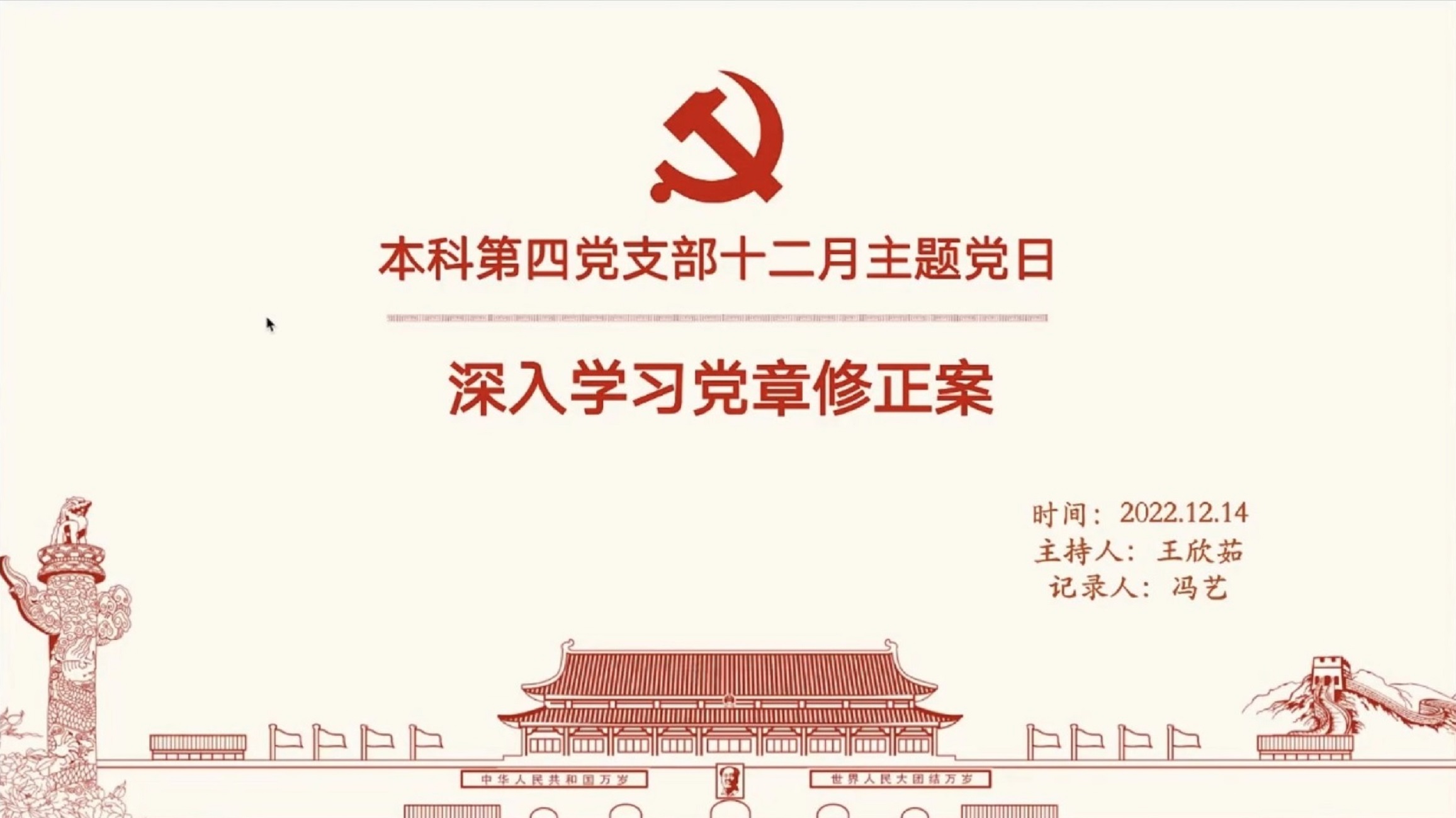 2022年12月14日下午14时,色情动漫 本科第四党支部开展“深入学习党章修正案”主题党日活动,重温党章历史,领会党章精神。会议由党支部副书记王欣茹主持,支部全体党员和若干积极分子参加会议。色情动漫 党委委员、本科第四党支部理论学习导师周文霞出席会议并进行指导。