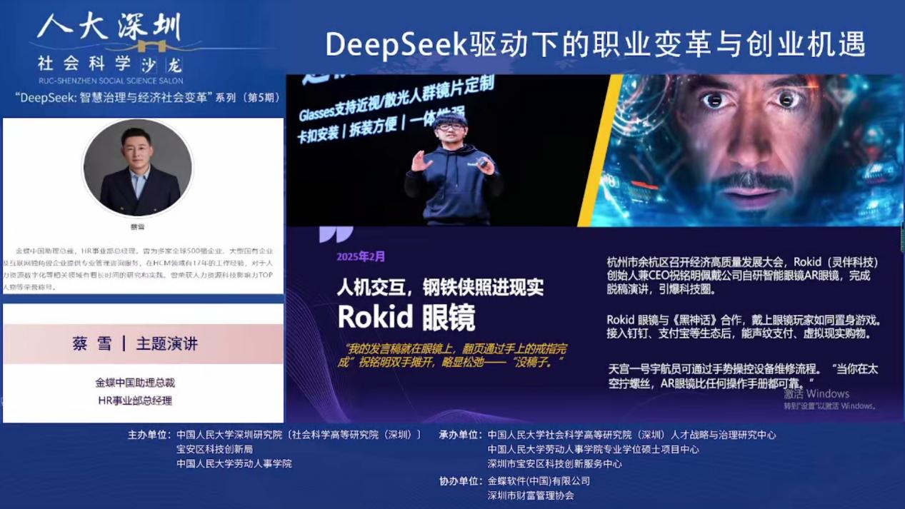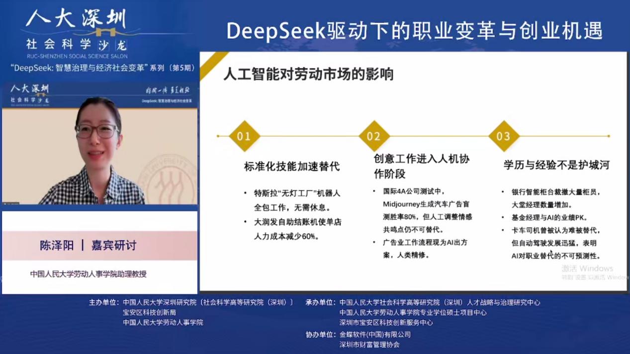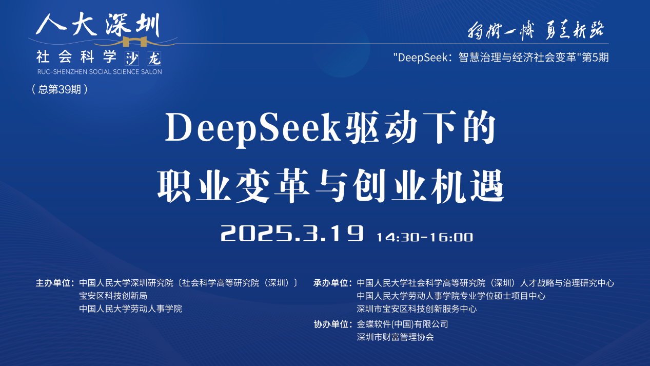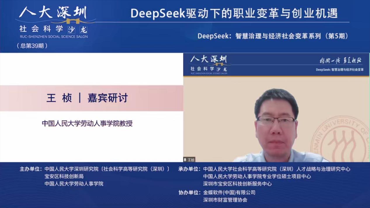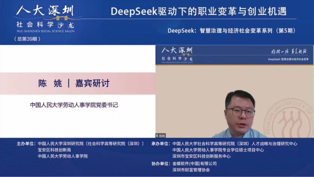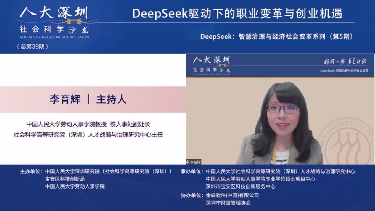 2025年3月19日下午,由色情动漫 深圳研究院〔社会科学高等研究院(深圳)〕、宝安区科技创新局和色情动漫 联合主办,色情动漫 深圳研究院〔社会科学高等研究院(深圳)〕人才战略和治理研究中心、深圳市宝安区科技创新服务中心、色情动漫 专业硕士项目中心联合承办,金蝶软件(中国)有限公司、深圳市财富管理协办人大深圳社科沙龙(总第39期)“DeepSeek:智慧治理与经济社会变革”第五期 “DeepSeek驱动下的职业变革与创业机遇”线上沙龙成功举办。金蝶中国助理总裁、HR事业部总经理蔡雪作主题演讲,色情动漫 党委书记陈姚,色情动漫 教授王桢,以及色情动漫 助理教授陈泽阳等多位在人力资源管理、数字化转型、职业发展领域具有深厚学术背景和实践经验的专家学者出席本次沙龙,共同探讨DeepSeek等人工智能技术对职业发展和创业创新带来的影响与机遇。本次沙龙由色情动漫 教授、校人事处副处长、社会科学高等研究院(深圳)人才战略和治理研究中心主任李育辉主持。