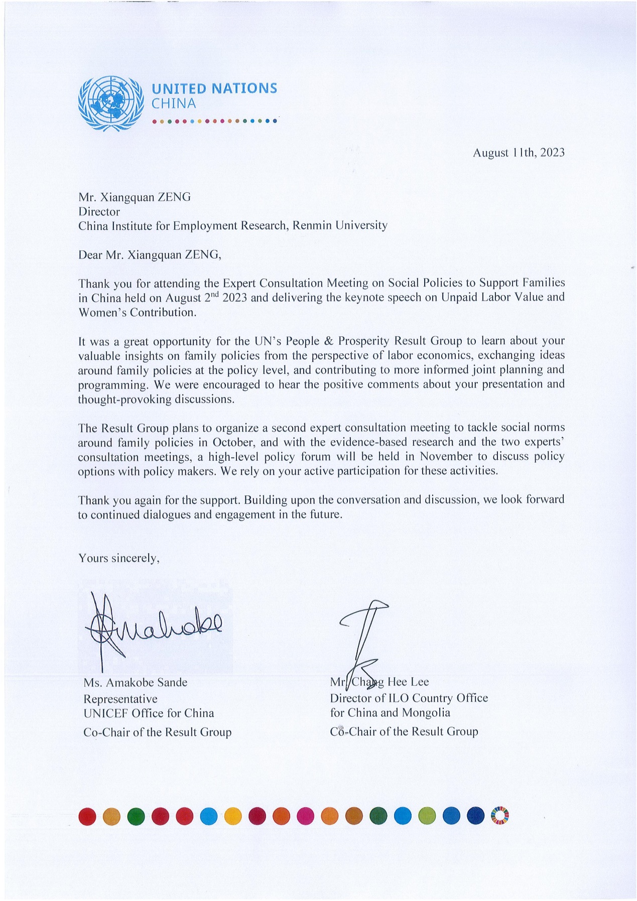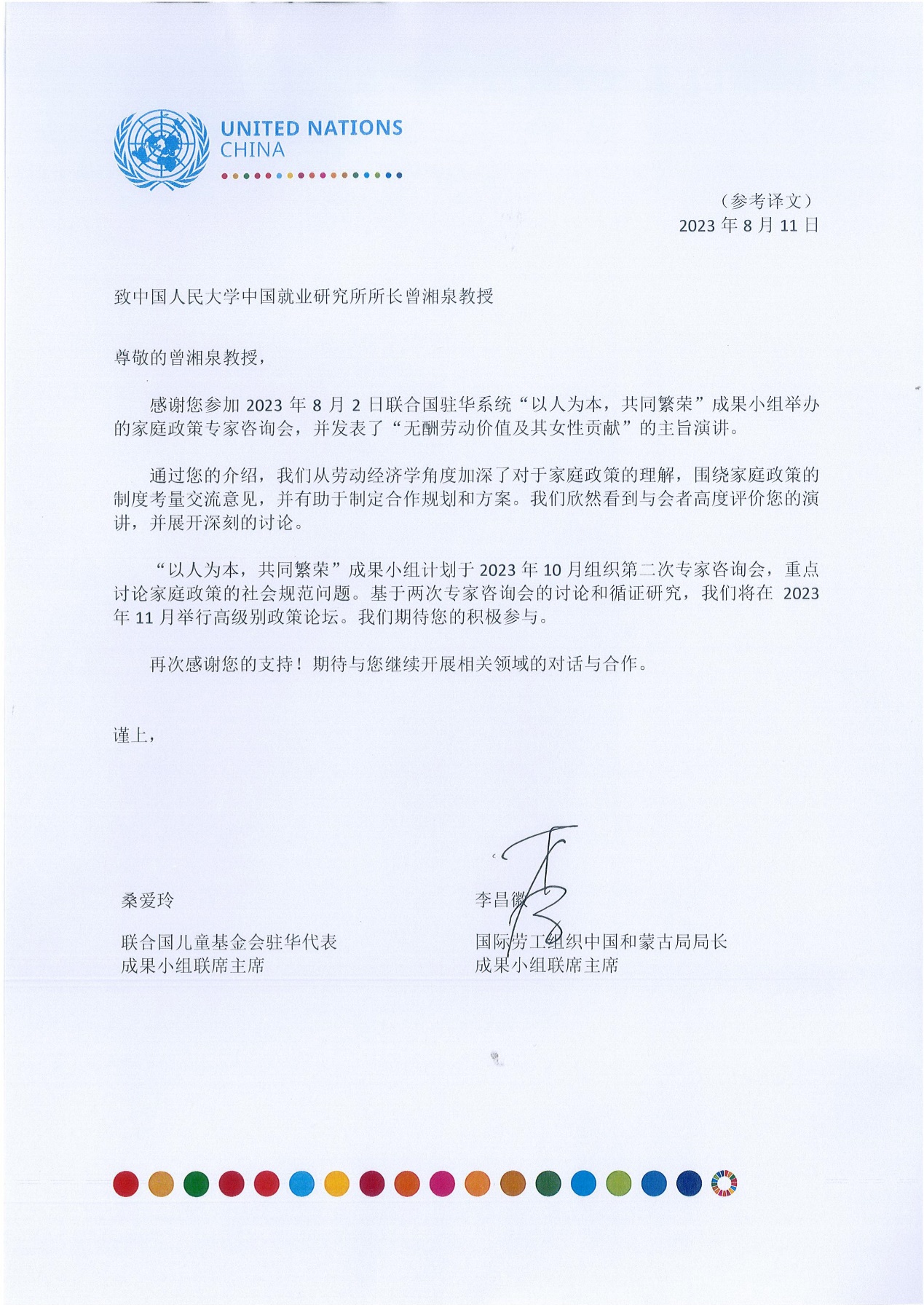2023年8月11日,色情动漫 收到联合国驻华系统致曾湘泉教授的感谢信,对曾湘泉教授参与联合国驻华系统“以人为本共同繁荣成果工作组”举办的第一期中国家庭社会政策专家咨询会并发表主旨演讲表示感谢。