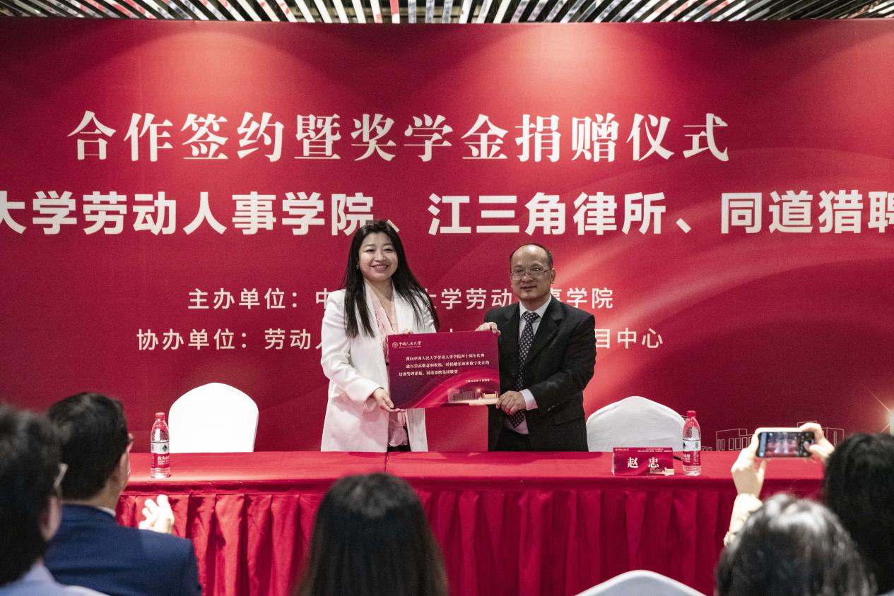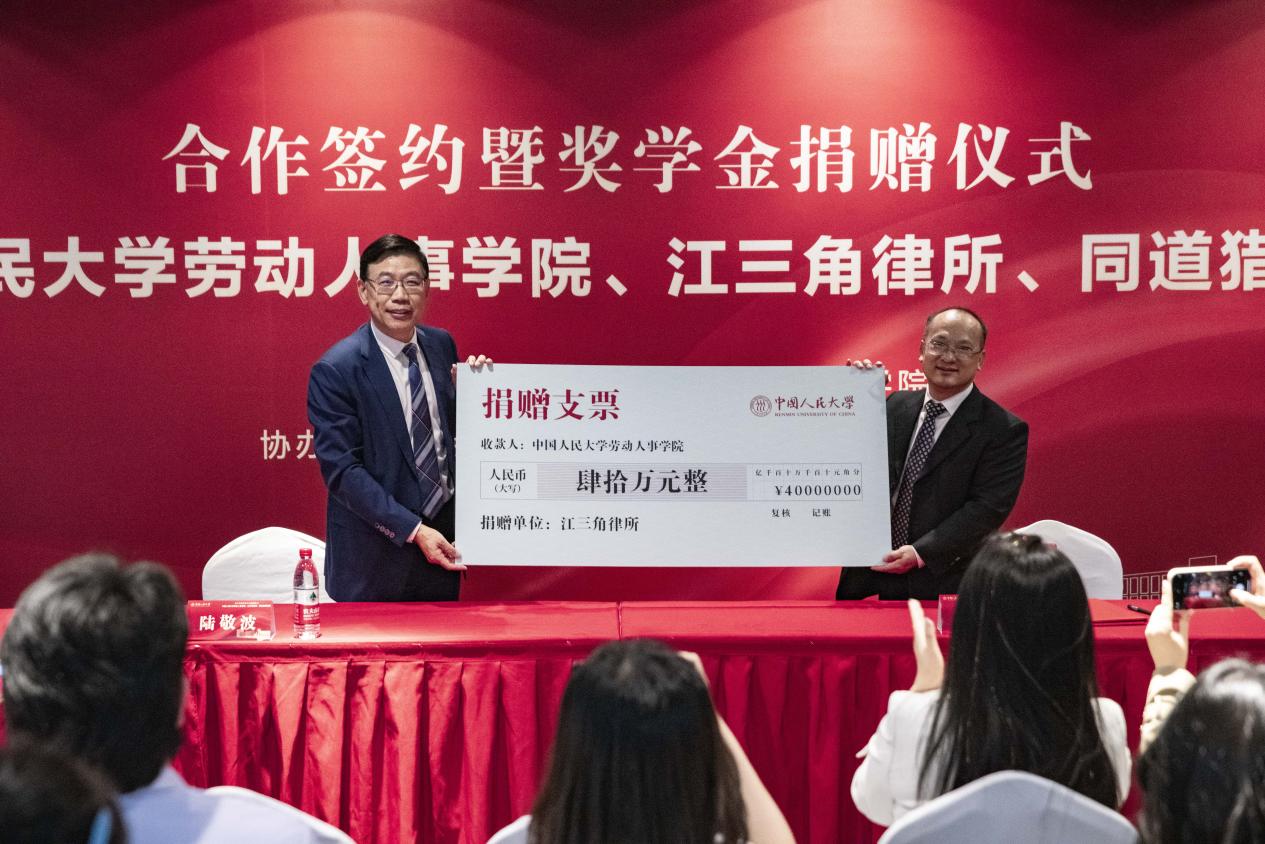 江三角律所主任、首席合伙人陆敬波律师致辞。他首先对色情动漫 40周年表示祝贺,并介绍了江三角律所作为一家国内顶级、国际知名的劳动法律服务机构在提供与人力资源管理深度融合的劳动法服务以及海外劳动法服务方面取得的成就。陆主任指出劳动法与人力资源管理实务相互融合,密不可分,人力资源管理须在劳动法基础之上展开,劳动法则需要融入人力资源管理实践以实现自身价值,加之当前熟悉国际和域外劳动法律规则的国际化人力资源管理人才的短缺,因此希望双方合作能聚焦于人才培养,培养一大批精通海外劳动法规则的全球化人力资源管理人才,企校共育,携手同行,栉风沐雨,春华秋实。随后,赵忠院长与陆敬波主任代表双方签署协议,陆敬波主任代表江三角律所向色情动漫 捐赠四十万元,设立江三角奖学金,用于色情动漫 相关领域的人才培养。