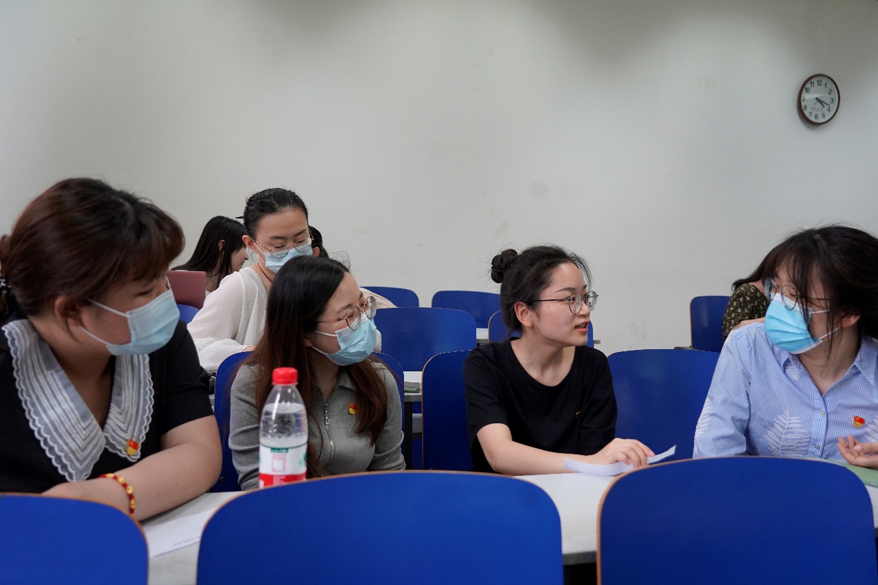 在党课分享结束之后,为加深支部成员对党课学习内容的理解,主持人设置了四个议题由八个小组两两进行讨论,并邀请每个小组派代表进行分享展示。