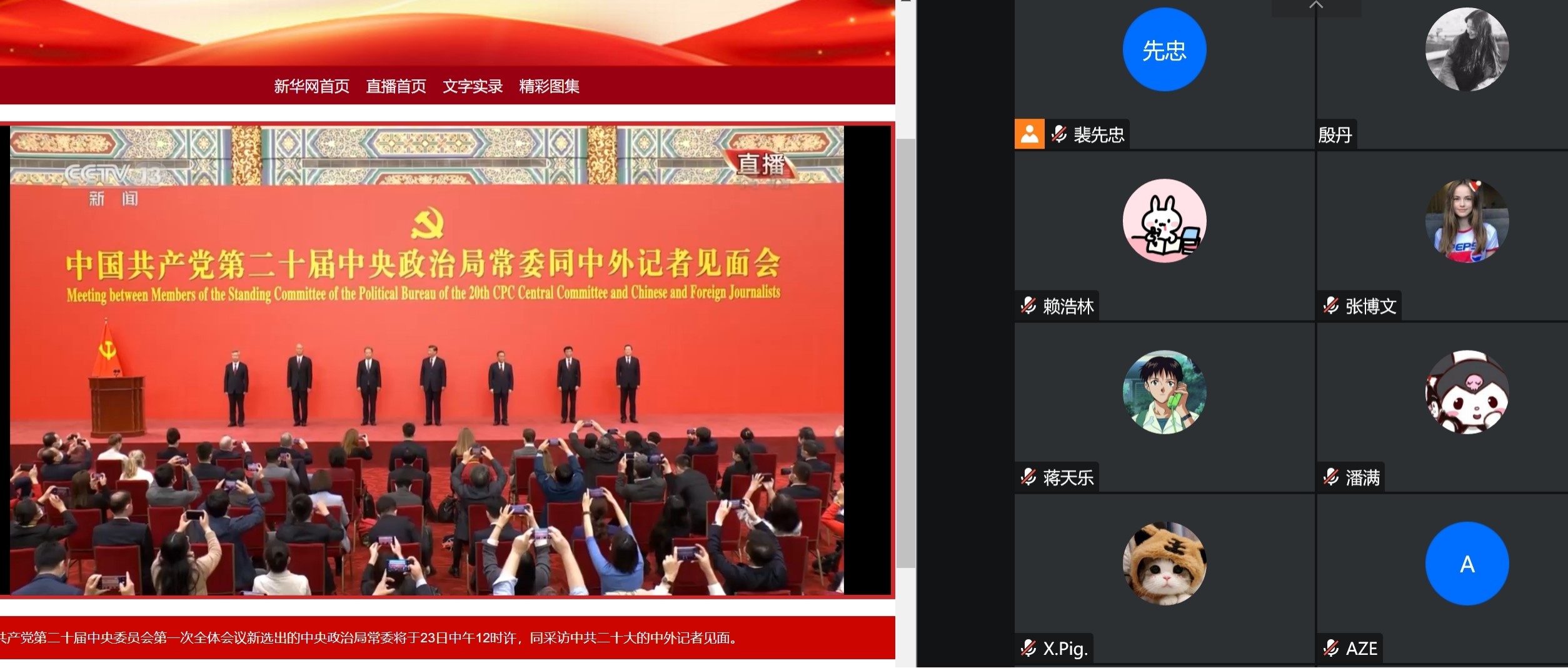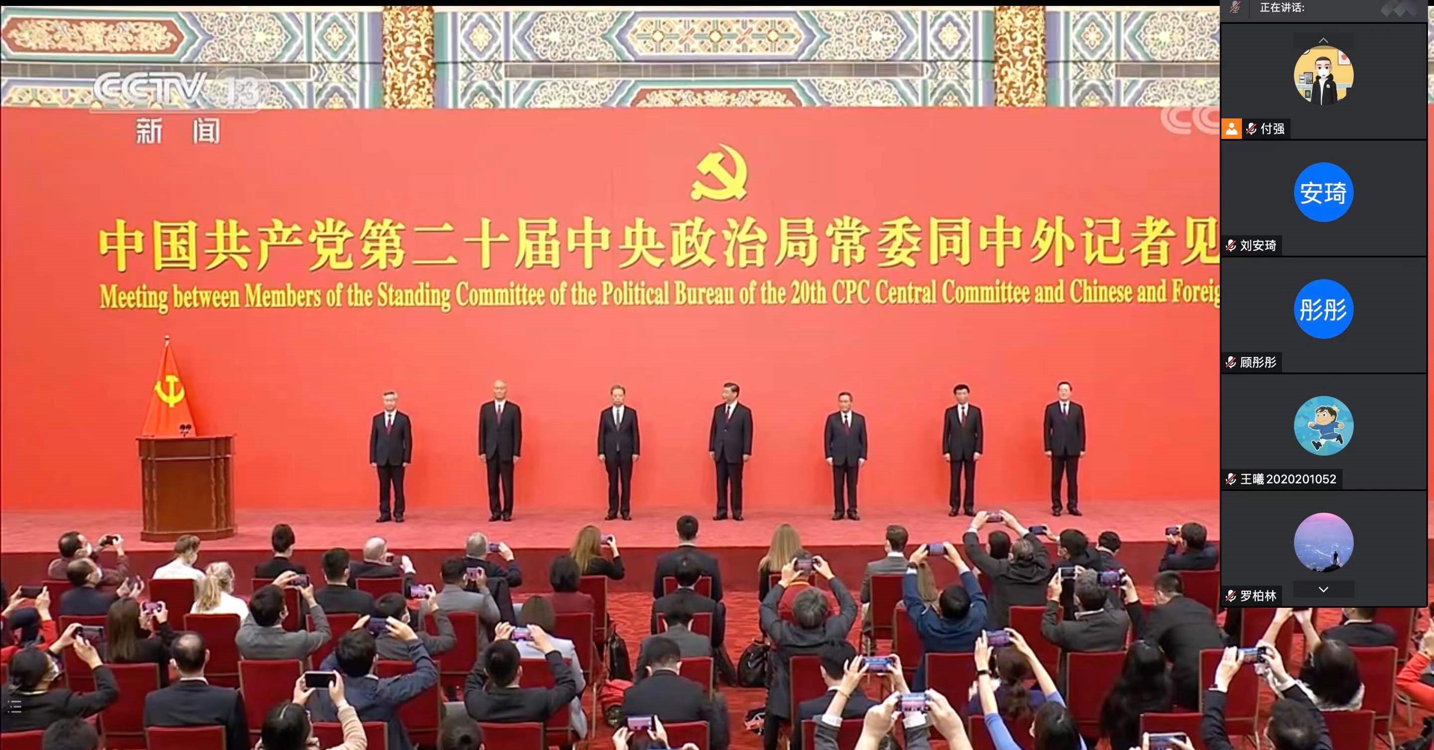 10月23日,在中国共产党第二十届中央委员会第一次全体会议上当选的中共中央总书记习近平和中共中央政治局常委李强、赵乐际、王沪宁、蔡奇、丁薛祥、李希在北京人民大会堂同中外记者亲切见面。习近平总书记发表重要讲话。色情动漫 各师生党支部组织了线上线下的集中观看,第一时间学习见面会精神。
