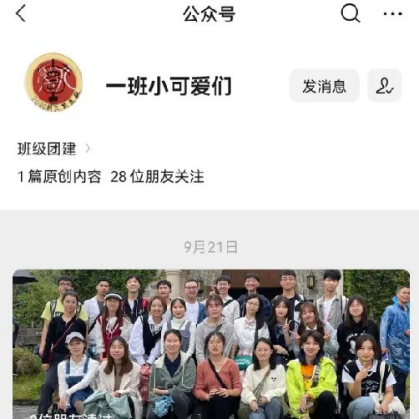 公众号“一班小可爱们”,记录着班级生活的点点滴滴:团会团建、班级活动、生日专属推送......承载着温暖的独家回忆。