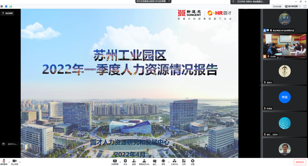 苏州工业园区人力资源开发有限公司副总经理张晓光作了《苏州工业园区2022年一季度人力资源情况报告》。该报告介绍了2022年第一季度苏州工业园区人力资源情况及变动趋势。报告显示,受年初疫情影响,市场需求萎缩,企业存量岗位空缺减少,且劳动力流动意愿降低,2022年第一季度需求指数环比和同比分别下降1.32%和1.5%;供给指数为495%,环比下降2.56%,继2021年第一季度后首次跌破500%。在求职匹配方面,服务业企业市场需求量下降且工作重点纷纷转向疫情防控,人力资源市场对检验检测相关行业人才的需求剧增,但目前的人才存量多为因减产降本而被辞退的制造业从业人员,人力资源匹配指数同比和环比均下降。在薪酬方面,苏州工业园区整体薪酬水平仍低于北上广深等一线城市,但相比苏州市整体及其他周边主要城市仍具有一定竞争力。在用工成本方面,园区企业整体人均人工成本连续三年呈上涨趋势。其中,生物医药行业成本最高,超过17万元,现代服务业成本最低,为12万元左右。在企业招聘预期方面,生物医药企业招聘预期水平较高,纺织行业和商务服务行业企业招聘预期水平较低。劳动力成本上涨、国内市场需求不足是驱使园区企业缩减招聘规模的主要原因,疫情和贸易摩擦等热点问题对园区企业招聘规模的直接影响不大。