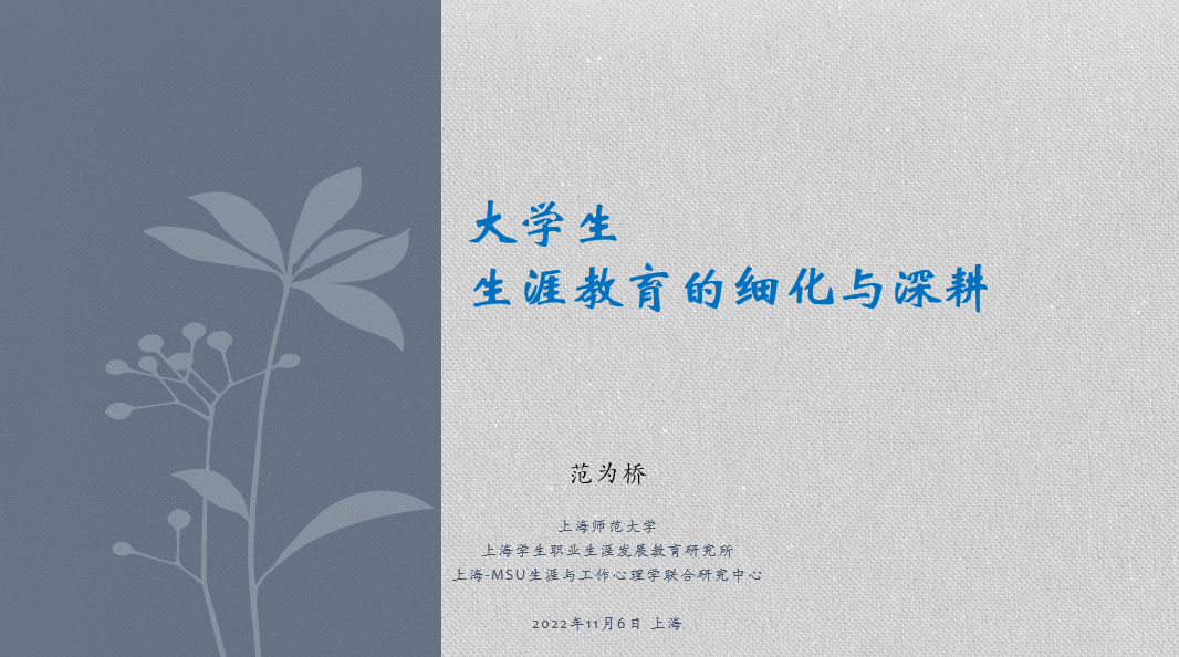范为桥教授的报告主题为“大学生涯教育的细化与深耕”。范为桥老师首先对大学生涯教育的现状进行介绍,指出目前我国大学生涯教育课程体系基本形成,师资队伍初步具备,实践咨询积极开展。但是生涯教育也面临着问题和挑战,需要加强教学效果、咨询实践和效度研究。然后范为桥老师从理论上阐述了生涯教育精细化的路径,提出要理论先行,要关注社会现象,并且要对当代大学生群体特征进行分析。接着范老师分享了他开展的四个大学生职业发展调查,考察了大学生职业生涯发展、生涯活动、学习情况、身心健康、个性发展等状况,并且从性别、社会阶层和代际差异三个方面进行详细分析。最后范老师对生涯教育的未来方向进行讨论,强调了生涯教育资源投放中心需从学校层面转到学生个体层面。王桢老师就样本特征和调查结果关系、调查对于高校职业生涯课程指导意义等方面进行了讨论。