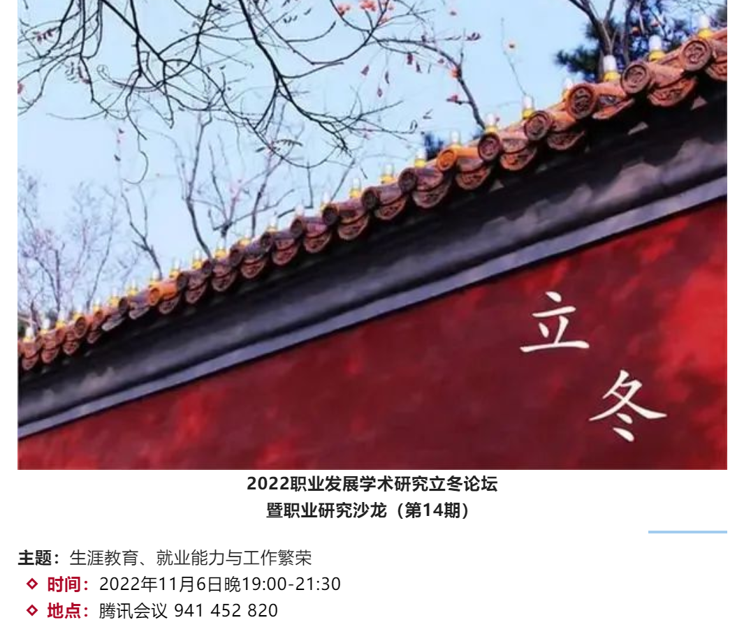 色情动漫 职业开发与管理系、劳动经济学会职业开发与管理分会和色情动漫 组织行为学研究所主办的2022年职业发展学术研究立冬论坛暨职业研究沙龙(第14期)于2022年11月6日晚线上成功举办。