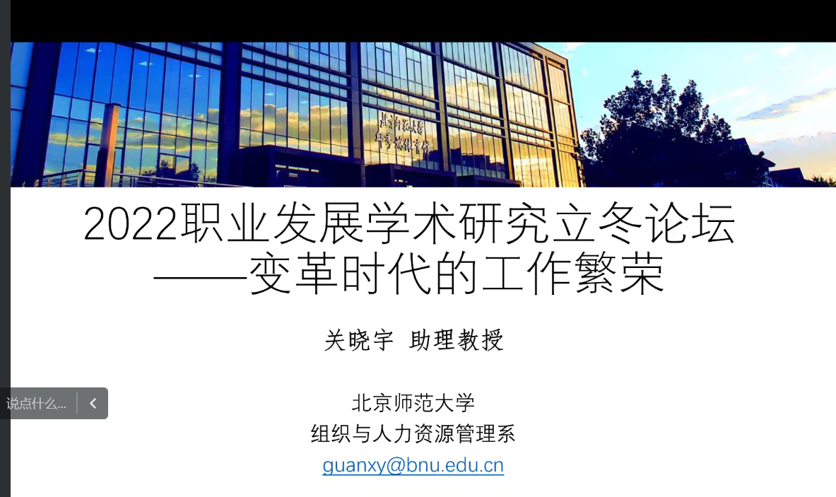 关晓宇助理教授的报告主题为“变革时代的工作繁荣”。关晓宇老师首先介绍了后疫情时代的工作重构。在此背景下,关老师结合自身的研究,尝试回答变革时代个体如何实现工作繁荣。关老师分享的三项研究分别着重探讨了适应力、重塑工作定位和个体资源对个体职业行为和工作繁荣的影响。最后关老师分享了其团队关于工作繁荣的结果变量的元分析研究,研究结果发现在无边界和易变性的职业生涯时代,以保持活力和学习为特征的工作繁荣状态对个体的职业发展起到了关键的作用。金秋萍老师就技术变化对工作繁荣的影响、工作繁荣的概念和工作繁荣的实践启示等问题与关老师展开了进一步的讨论。