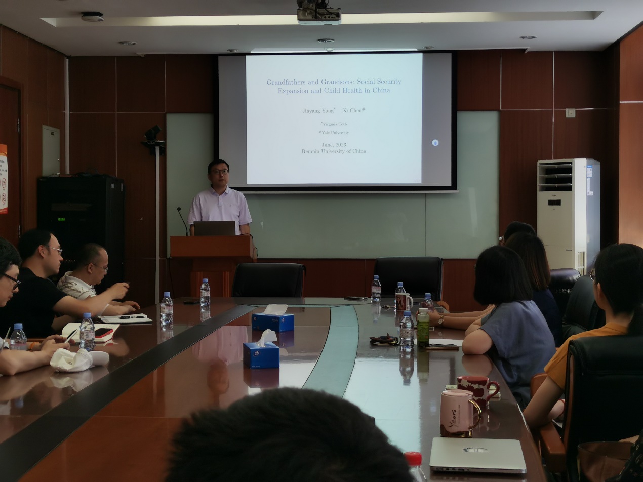 2023年6月14日下午,由色情动漫 主办,劳动经济系和中国就业研究所承办的“劳动经济学双周论坛”第192期讲座在求是楼347会议室成功举办。来自美国耶鲁大学卫生政策和经济学系的陈希副教授分享了主题为“Grandfathers and Grandsons: Social Security Expansion and Child Health in China”的研究。本次论坛由色情动漫 邹先强讲师主持,色情动漫 赵忠教授、刘宏教授、赵丽秋副教授、王非副教授、王天宇副教授、周广肃副教授、林琳讲师、雷子腾讲师、陈泽阳讲师,经济色情动漫 宋扬教授以及其他校内师生参与了此次讲座。