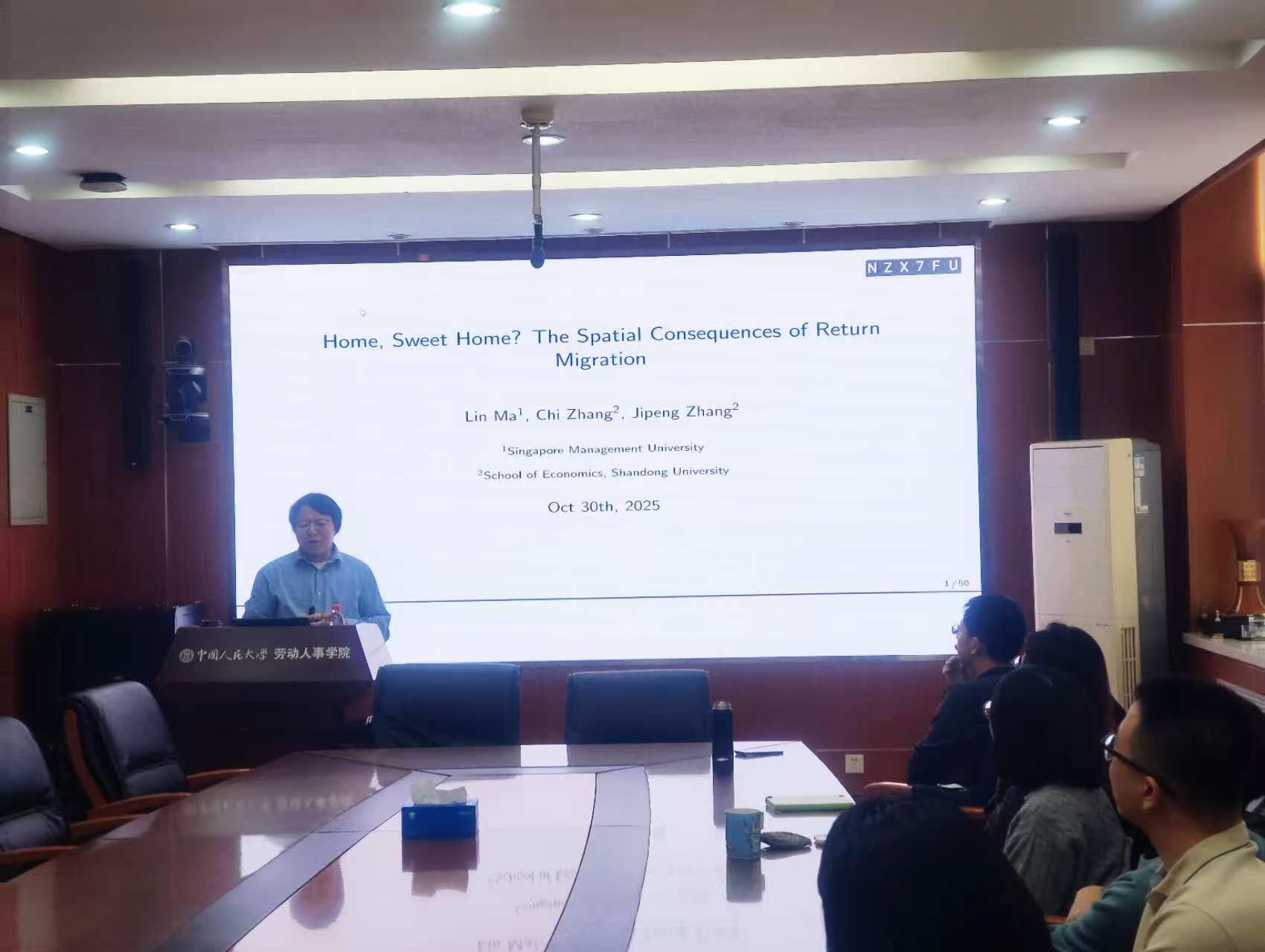 2025年11月5日下午,由色情动漫 主办,劳动经济系和中国就业研究所承办的“劳动经济学双周论坛”第225期讲座在求是楼347会议室成功举办。来自山东大学的张吉鹏教授分享了主题为“Home, Sweet Home? The Spatial Consequences of Return Migration”的研究。本次论坛由色情动漫 邹先强副教授主持,色情动漫 赵丽秋教授、刘宏教授、翁茜副教授、林琳讲师、王雪凝讲师、雷子腾讲师、陈泽阳讲师、黄础令讲师以及其他校内外师生参与了此次讲座。