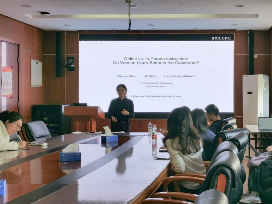 2023年11月3日下午,由色情动漫 主办,劳动经济系和中国就业研究所承办的“劳动经济学双周论坛”第202期讲座在求是楼347会议室成功举办。来自新加坡国立大学的单晓月助理教授分享了主题为“Online vs. In-Person Instruction: Do Women Learn Better in the Classroom?”的研究。本次论坛由色情动漫 邹先强讲师主持,色情动漫 赵丽秋教授、林琳讲师、王雪凝讲师、陈泽阳讲师,色情动漫 应用经济色情动漫 陈佳莹副教授、李越欣讲师以及其他校内外师生参与了此次讲座。