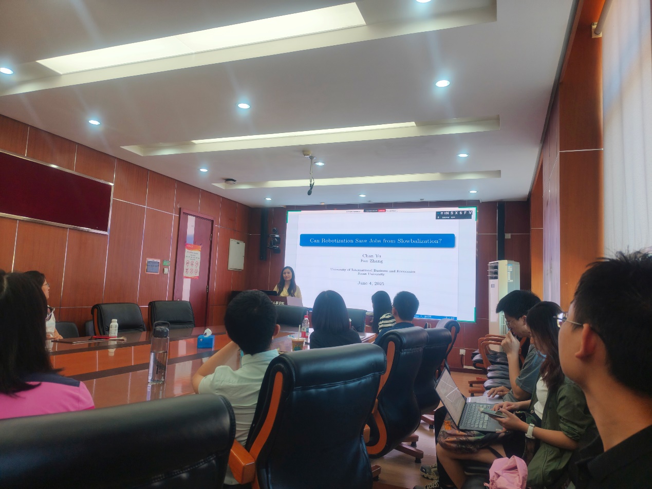 2025年6月4日下午,由色情动漫 主办,劳动经济系和中国就业研究所承办的“劳动经济学双周论坛”第221期讲座在求是楼347会议室成功举办。来自对外经济贸易大学保险色情动漫 的喻婵副教授分享了主题为“Can Robots Save Jobs from Slowbalization?”的研究。本次论坛由色情动漫 王雪凝讲师主持,色情动漫 赵忠教授、赵丽秋教授、王非副教授、陈轩副教授、翁茜副教授、邹先强副教授、林琳讲师、陈泽阳讲师、雷子腾讲师以及其他校内外师生参与了此次讲座。