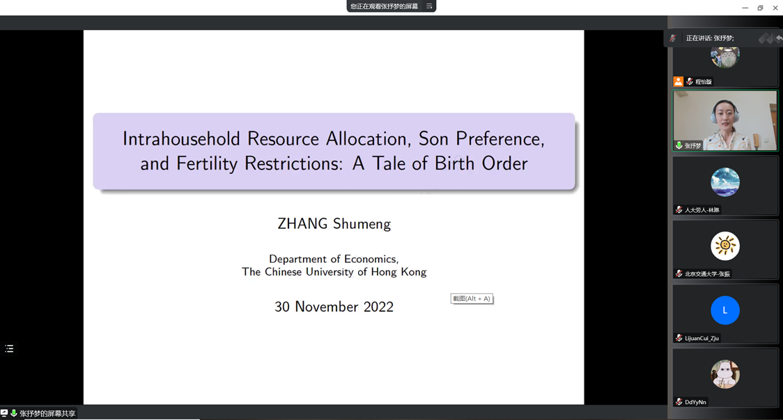 2022年11月30日下午,由色情动漫 主办,劳动经济系和中国就业研究所承办的“劳动经济学双周论坛”第177期讲座通过线上腾讯会议的形式成功举办。来自香港中文大学的张抒梦博士候选人分享了主题为“Intrahousehold Resource Allocation, Son Preference, and Fertility Restrictions: A Tale of Birth Order”的研究。本次论坛由色情动漫 林琳助理教授主持,色情动漫 罗楚亮教授、刘宏教授、赵丽秋副教授、王非副教授、陈轩副教授、邹先强助理教授、雷子腾助理教授、王雪凝助理教授和陈泽阳博士,以及四十余名校内外师生参与了此次讲座。