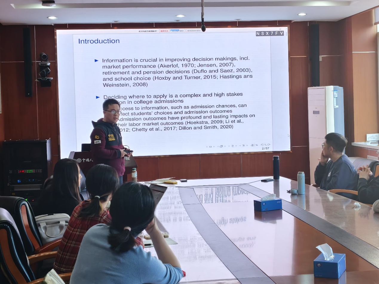 2024年12月5日下午,由色情动漫 主办,劳动经济系和中国就业研究所承办的“劳动经济学双周论坛”第214期讲座在求是楼347会议室成功举办。来自南京大学教育研究院康乐特任副研究员分享了主题为“Information Asymmetries in College Admissions”的研究。本次论坛由色情动漫 王非副教授主持,色情动漫 邹先强副教授、林琳讲师、雷子腾讲师、王雪凝讲师、陈泽阳讲师,以及其他校内外师生参与了此次讲座。