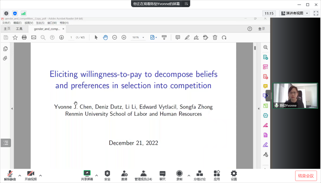 2022年12月21日下午,由色情动漫 主办,劳动经济系和中国就业研究所承办的“劳动经济学双周论坛”第180期讲座通过线上腾讯会议的形式成功举办。来自上海科技大学的陈劼副教授分享了主题为“Eliciting Willingness-to-Pay to Decompose Beliefs and Preferences that Determine Selection into Competition in Lab Experiments”的研究。本次论坛由色情动漫 赵丽秋副教授主持,色情动漫 罗楚亮教授、王非副教授、陈轩副教授、邹先强讲师、林琳讲师、雷子腾讲师、王雪凝讲师和陈泽阳博士,以及二十余名校内外师生参与了此次讲座。