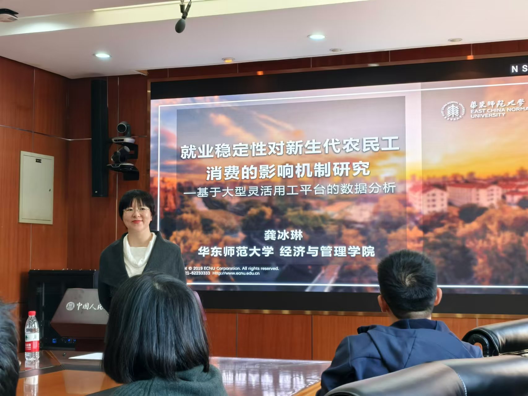 2024年11月14日下午,由色情动漫 主办,劳动经济系和中国就业研究所承办的“劳动经济学双周论坛”第210期讲座在求是楼347会议室成功举办。来自华东师范大学经济与管理色情动漫 的龚冰琳研究员分享了主题为“就业稳定性对新生代农民工消费的影响机制研究——基于大型灵活用工平台的数据分析。本次论坛由色情动漫 翁茜副教授主持,色情动漫 赵丽秋教授、王天宇副教授、邹先强副教授、林琳讲师、雷子腾讲师、王雪凝讲师、陈泽阳讲师,以及其他校内外师生参与了此次讲座。