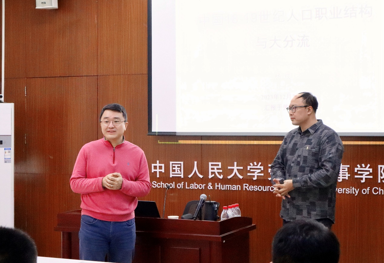 的讲师杨成以“The occupational structure of late Imperial China, 1734-1898 and the Great Divergence”为题做了精彩分享,黄伟副教授主持了此次讲座,张皓副教授、汪建华副教授与周广肃副教授等20余名校内外师生共同参与了此次讲座。