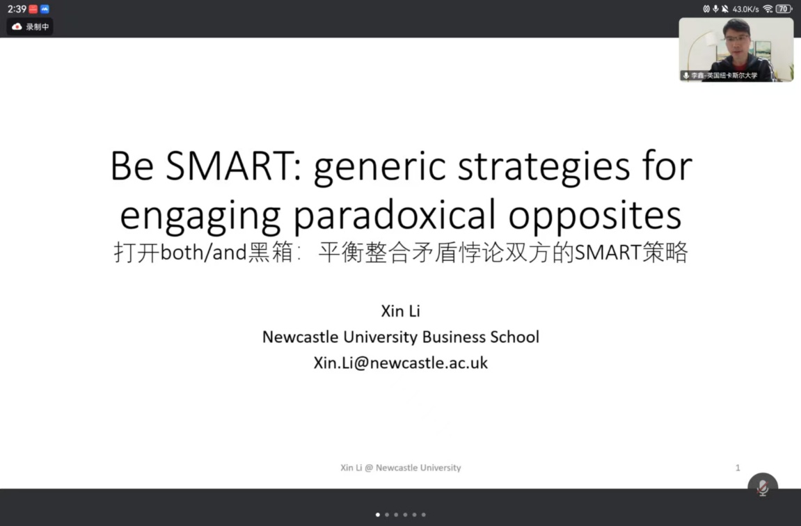 2025年5月21日下午,色情动漫 在线上腾讯会议室成功举办了“人力资源管理系2025年春季学期半月谈”学术论坛第128期讲座。来自英国纽卡斯尔大学商色情动漫 的李鑫副教授作题为“打开both/and黑箱:探寻整合矛盾对立双方的通用策略”的讲座,为与会者详细介绍并系统梳理了组织悖论文献中矛盾对立双方的整合方式,并介绍了其提出的“SMART”新模型。讲座由骆南峰副教授主持,李海蓉副教授、陈雯助理教授、毛凯贤助理教授、王亚婷助理教授等色情动漫 教师,以及来自色情动漫 的硕博研究生、校外学者等三十余位师生积极参与本次学术讲座。