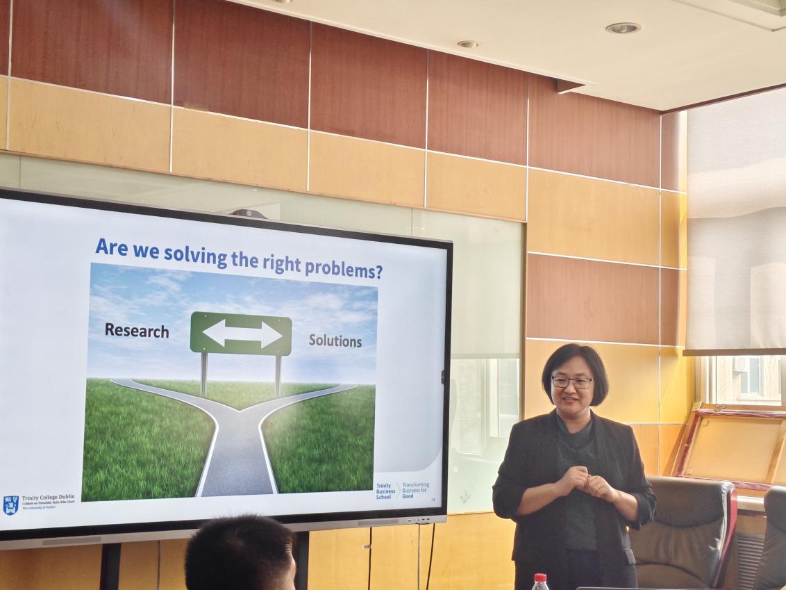 付娜教授作为圣三一大学数字商业与分析中心联合主任,深耕欧洲及全球范围内数字化转型、负责任的人工智能与人力资源管理等前沿领域。结合丰富的学术研究成果、研究项目与企业咨询经历,付娜教授指出数智化时代下,人工智能、工作形态、技能体系与组织模式都在发生着巨大的变化,重塑着工作方式、领导力内涵及组织核心能力。与此同时,当下HRM领域的研究与教学在很大程度上滞后于这些结构性变革,难以将研究成果真正地落地于社会实际问题的解决中。与会教师和同学也普遍认为,HRM领域研究呈现出的理论导向、研究成果与企业需求不匹配的矛盾日趋突出。因此,付娜教授认为优秀的研究应该指向实践中的真实问题,特别是在人工智能时代表现出的技能短缺、AI与工作、老龄化劳动力等社会性议题。