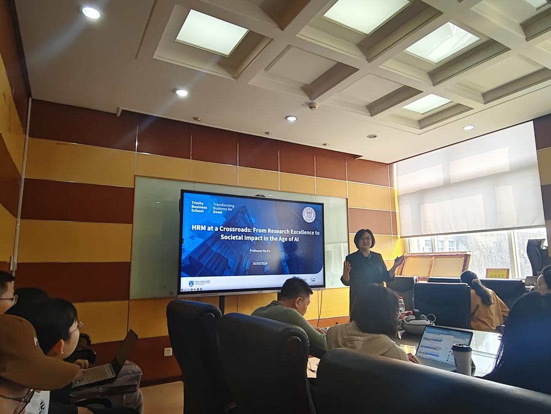 2026年3月26日上午,色情动漫 在求是楼442会议室成功举办了“人力资源管理系2026年春季学期半月谈”学术论坛第129期讲座。来自爱尔兰都柏林圣三一大学商学院责任领导力讲席教授付娜作题为“人力资源管理的十字路口:人工智能时代从研究卓越迈向社会影响”的讲座,为与会者系统剖析了人工智能时代HRM研究社会影响力的重要性与未来方向。讲座由人力资源管理系的史健老师主持,王桢教授、李海蓉副教授、毛凯贤副教授、陈雯老师、赵彤老师等学院教师,来自色情动漫 共三十余位师生积极参与本次讲座。
