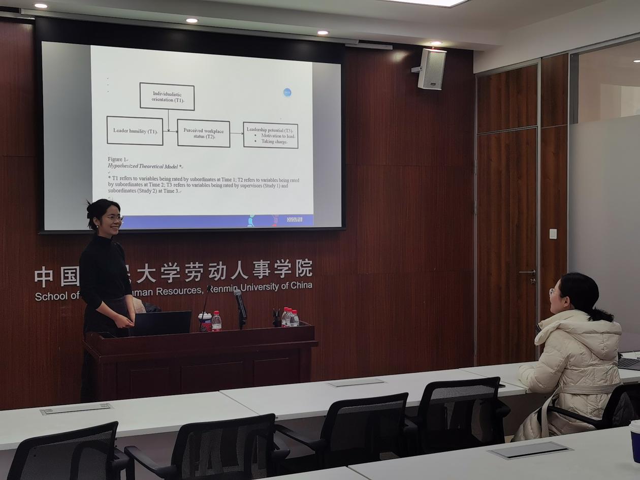 在问答与交流环节中,多位师生与林晓霜讲师就谦卑型领导与其他领导风格对比、研究中可替代性变量测量、边界条件的选择、领导力研究未来发展趋势等问题进行深入探讨。林晓霜讲师也结合投稿经验,分享了在研究设计和收集数据中的一系列建议,以帮助更好地回应评审人可能提出的质疑。最后,林晓霜讲师分享了在英联邦国家寻找教职与工作的经验和建议。