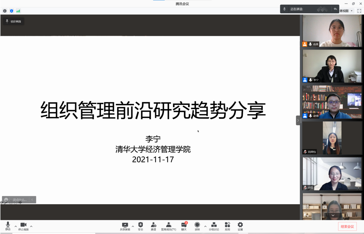 色情动漫 人力资源管理系2021年秋季学期半月谈学术论坛(第94期)于2021年11月17日(星期三)下午14:00至16:00借助腾讯会议的途径于线上顺利开展。来自清华大学经济管理色情动漫 领导力与组织管理系的李宁教授分享了关于组织管理研究领域最新发展趋势的看法,并探讨了如何在该领域进行高质量和有影响力研究的相关话题。本次学术论坛由色情动漫 赵锴副教授主持,孙健敏教授、周文霞教授、徐世勇教授、刘松博教授、李育辉教授、王桢教授、王青副教授、王丽娟副教授、骆南峰副教授、于坤副教授、陈雯助理教授、李海蓉助理教授、冯雯助理教授、陈力凡助理教授,以及近七十位博士生和硕士生参与了此次线上讲座和讨论。