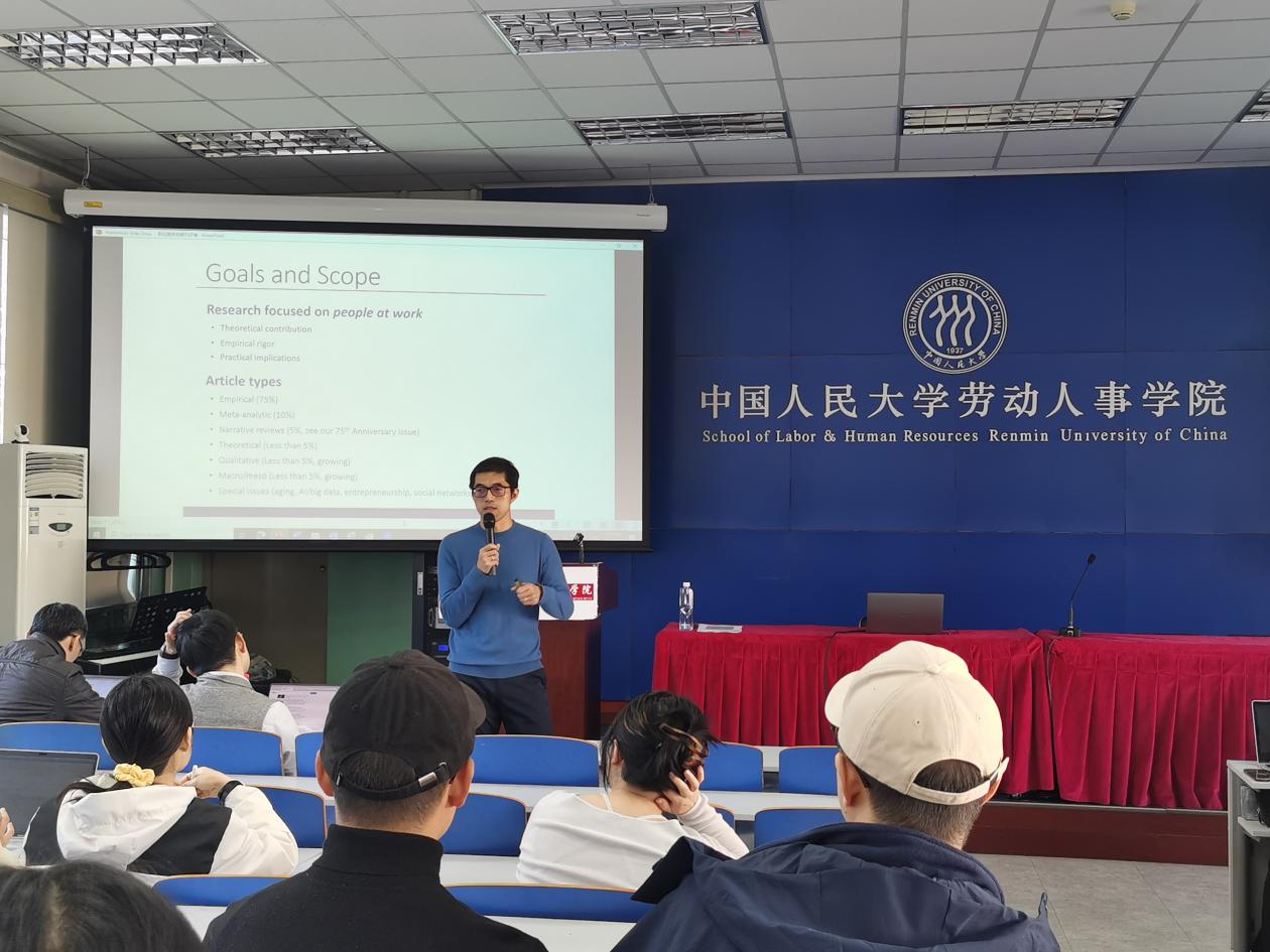 2023年11月9日上午,色情动漫 40周年院庆系列学术讲座暨“人力资源管理系2023年秋季学期半月谈”第113期讲座在求是楼440会议室成功举办。来自美国俄亥俄州立大学费舍尔商色情动漫 管理与人力资源系杰出教授、北京大学光华管理色情动漫 访问讲席教授姜铠丰作题为“学术服务和期刊评审的经验分享”的讲座,分享其对于参与学术职业服务的思考和作为期刊副主编对于发表高质量论文的建议。此次论坛由骆南峰副教授主持,孙健敏教授、魏昕教授、赵锴副教授、李海蓉副教授、陈力凡副教授、陈雯讲师、冯雯讲师、毛凯贤讲师等教师,来自对外经贸大学、北京航空航天大学、首都经贸大学、北京联合大学等兄弟院校的师生,以及七十多位来自色情动漫 的同学参加了此次讲座。